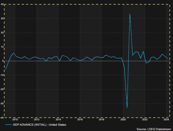 Yesterday’s US GDP report was troubling for several reasons. Growth slowed more than expected, but inflation was hotter than forecast. GDP expanded 1.6% in the first quarter, well below the 2.4% anticipated while core PCE inflation accelerated to 3.7% from 2.0%. The word ‘stagflation’ has been bandied about a lot since – compared to peers it hardly seems fair. But the US is supposed to be in the peak of health; running a 6% budget deficit and adding $1tn in debt every 100 days is delivering diminishing returns, however.