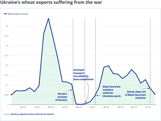 Another immediate economic impact has been the shift in wheat export dynamics. Russia has capitalised on the situation by increasing its wheat exports to countries that traditionally depended on Ukrainian wheat. This shift has not only altered global trade patterns but also inflicted a substantial welfare loss on Ukraine’s wheat producers, estimated at $1.4 billion. The loss encapsulates the broader economic and social toll of the conflict on Ukraine’s agricultural sector. Ukraine’s role as “Europe’s breadbasket” is an important one. Prior to the conflict, the nation was a top exporter of several key agricultural products, including sunflower oil, barley, maise, and wheat. The war caused a dramatic 29% drop in Ukraine’s grain production for the 2022/2023 period, severely limiting its export capacity. The Russian blockade of Ukraine’s Black Sea ports has been particularly detrimental, bringing exports to a near standstill and striking a blow to global food distribution networks. Additionally, Ukraine’s wheat exports are crucial for many Asian and African countries, many poorer nations rely on Ukrainian wheat to meet their food needs. With Russia’s decision to exit the Black Sea Grain Initiative, the situation has worsened, further straining the global food supply chain and heightening the food crisis. Since the 27% spike wheat prices have now collapsed to below pre-war levels, it seems that while there is clearly some significant influence at play here, the fundamentals of this market will ultimately always win out.