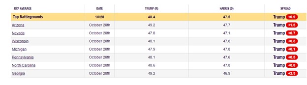Here is RealClearPolitics showing why the market is leaning towards a Trump victory. In recent days he has overtaken Harris on the popular vote. This is not reflected by all pollsters (FiveThirtyEight, for example, still shows Harris +1.4pts on the popular vote), but it’s an indication of the trend and momentum. A true October surprise moment.