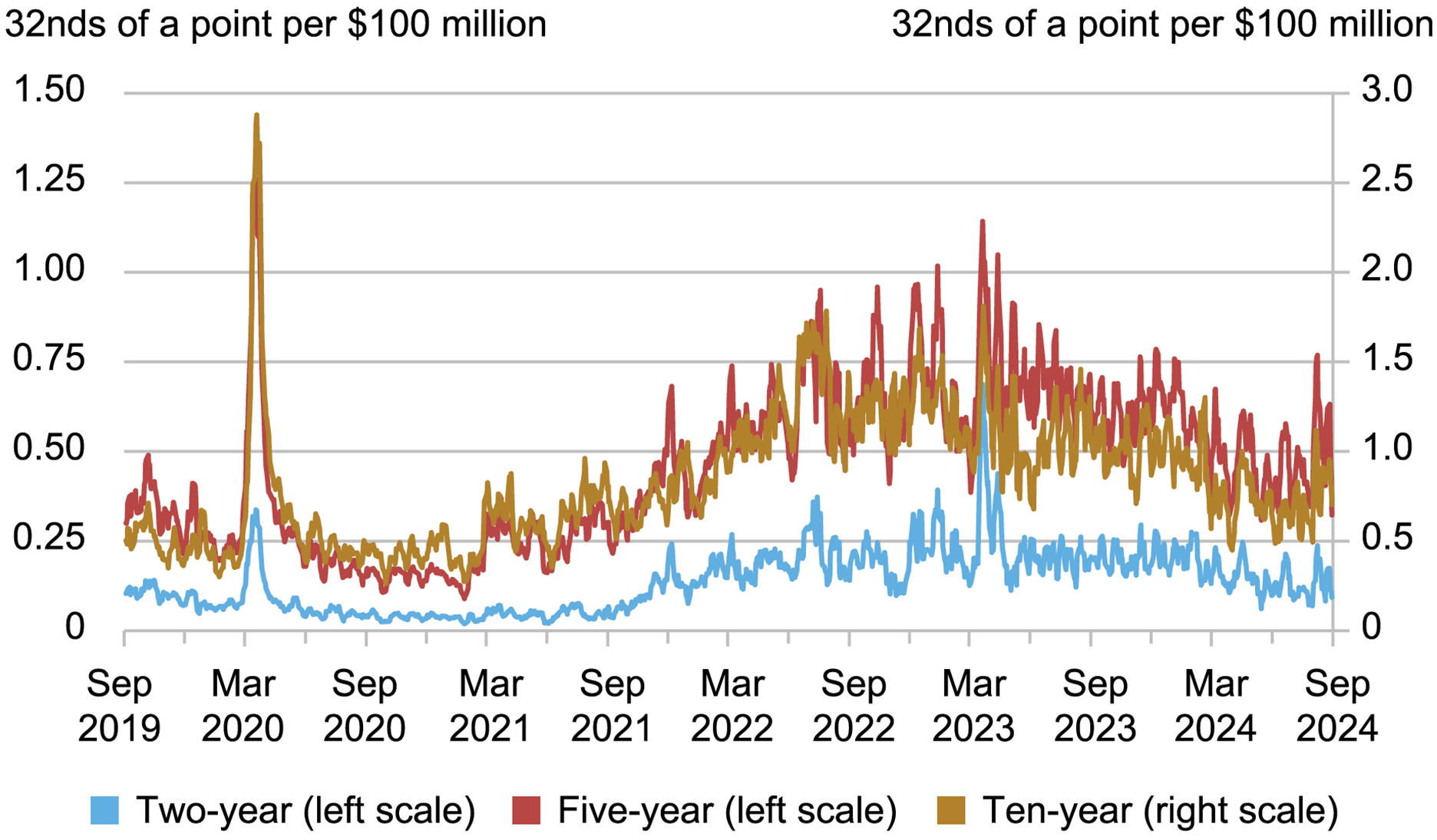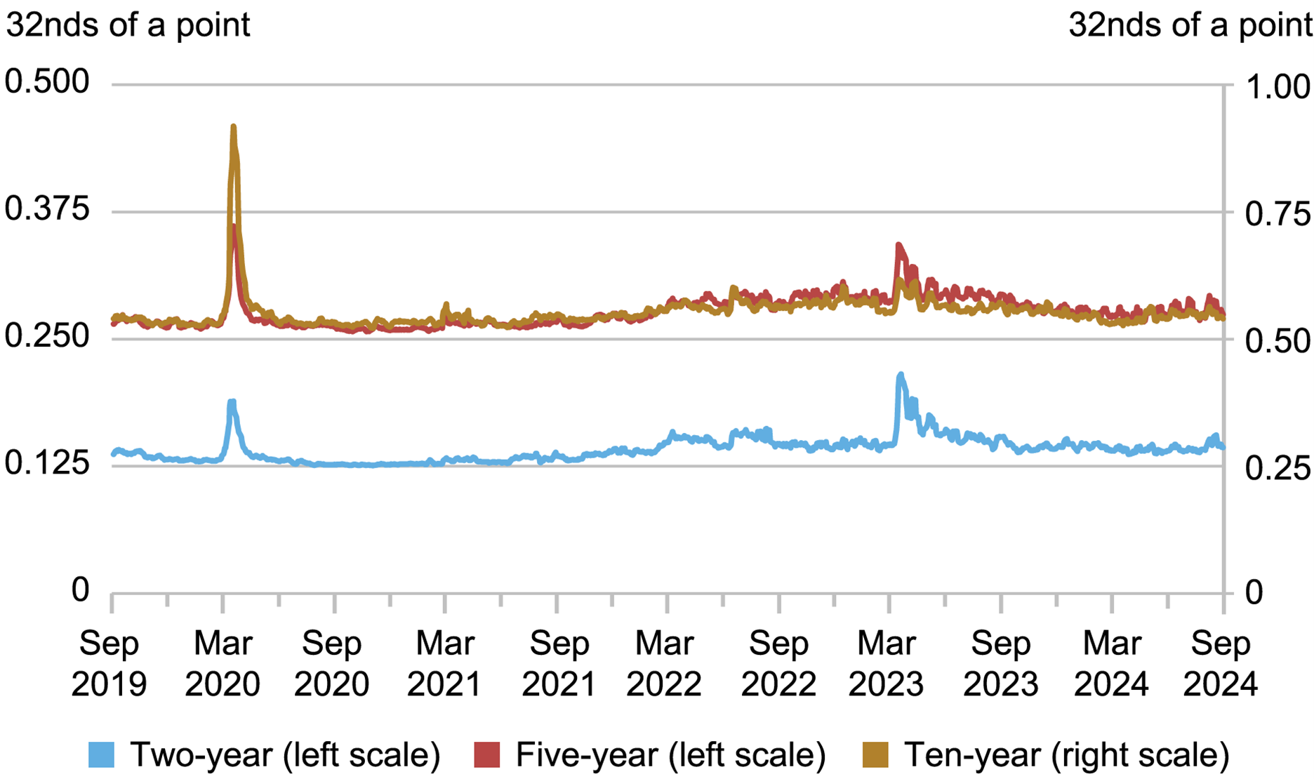 Notes: The chart plots five-day moving averages of average daily bid-ask spreads for the on-the-run two-, five-, and ten-year notes in the interdealer market from September 1, 2019 to August 31, 2024. Spreads are measured in 32nds of a point, where a point equals one percent of par.