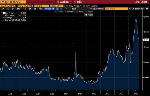 The ‘noise’ this measure shows has got louder this year. The higher the number, the less liquid the market – it recently hit 5 and although it has since come down sharply, remains elevated – staying well above the peak hit during the Covid liquidity squeeze.
